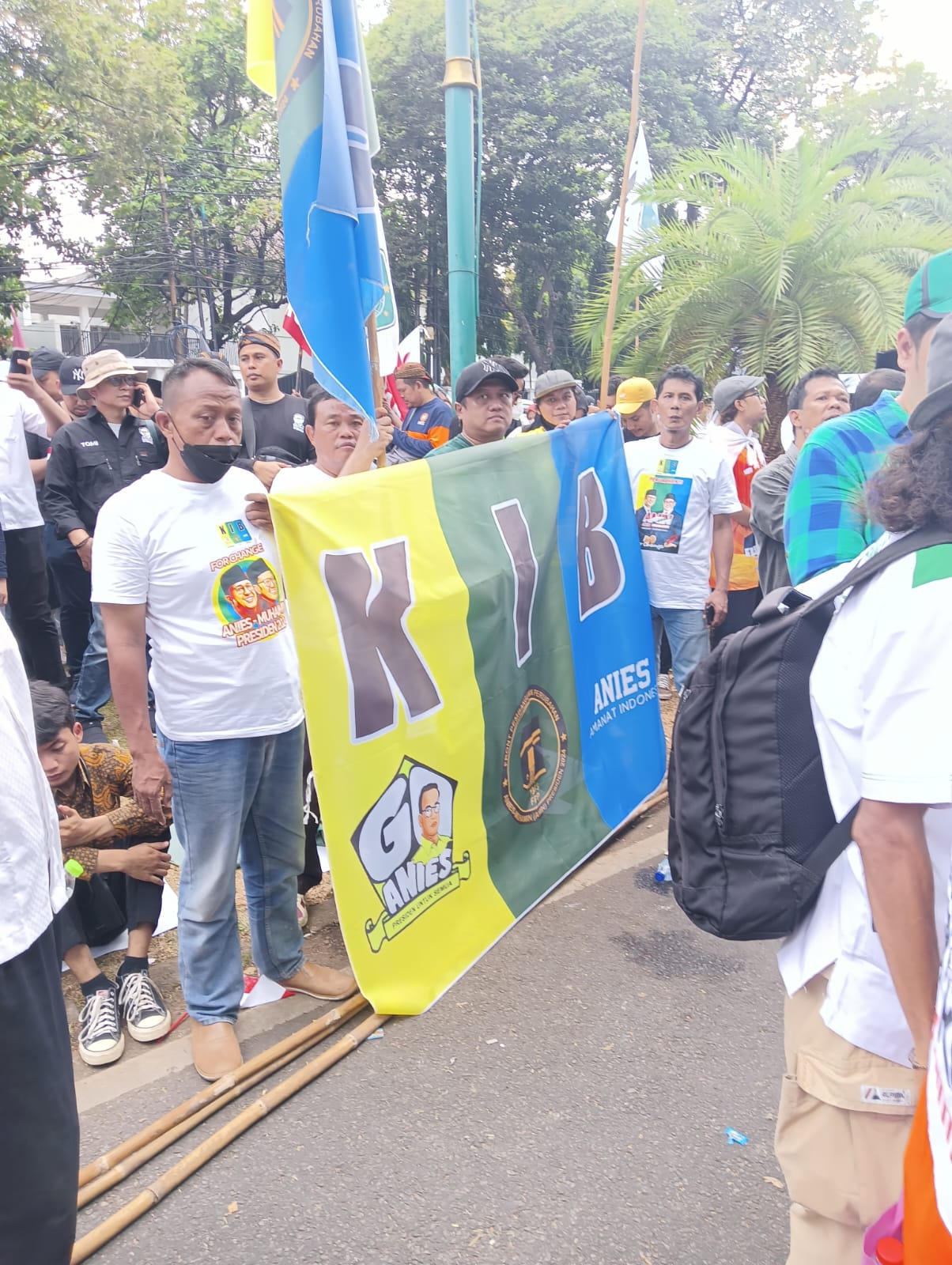 Masa dari Sekretariat Nasional Kuning Ijo Biru (SEKNAS KIB) yang mendukung Paslon AMIN ikut mendampingi ke ke KPU. Nampak sejumlah eksponen KIB antara lain Drs Habil Marati yang datang mulai